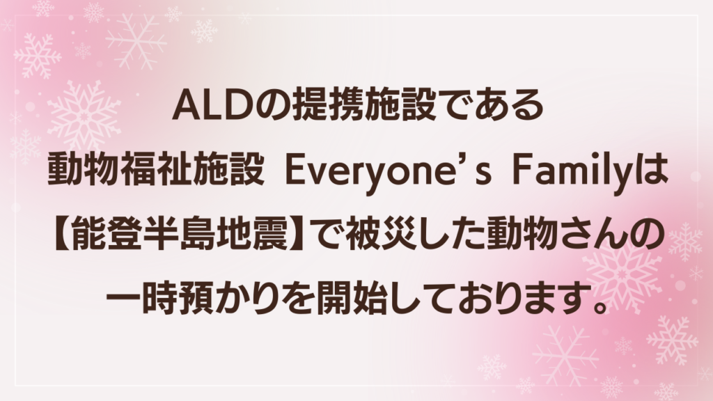 アニマルライフデザインの提携先であります「動物福祉施設Everyone's Family」は、現在【能登半島地震】で被災した動物さんたちの一時預かり施設として受け入れを開始しております。 2023.1月6日~SNSで発信。多くの皆様が拡散等のご協力をしてくださり、... -